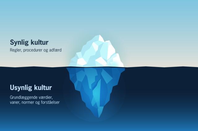 Kultur kan sammenlignes med et isbjerg: Det synlige lag over vandoverfladen består af regler, procedurer og adfærd – de formelle strukturer, vi kan observere. Men den største del af kulturen ligger under overfladen: Grundlæggende værdier, vaner, normer og forståelser, som påvirker, hvordan vi handler i praksis.